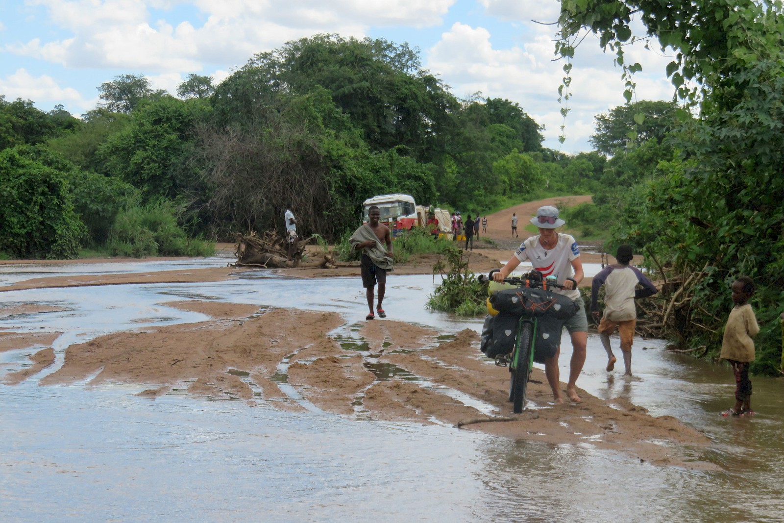 Auch in dieser Wildnis sind wir natürlich meist nicht alleine, aber wie auch zuvor auf uns selbst gestellt. Keine asphaltierte Hintertür, keine medizinische Infrastruktur und kein Wort Englisch werden uns hier im Ernstfall helfen. Die Landwirtschaft und Viehzucht betreibenden Einheimischen leben hier ein halbes Jahr lang mit und in den Schlamm- und Wassermassen, die sie von der sauberen Zivilisation trennen. Trotzdem finden sich immer wieder kleine Inseln der Rast in Form eines heruntergekommenen Schulgebäudes, unter dessen Vordach wir die Nacht verbringen, oder eines wasserdichten Strohdaches, unter dem wir gemeinsam mit den Dorfbewohner*innen einen plötzlichen Regenguss abwarten dürfen. Die Kinder hier sind auf während der Safarisaison offenbar zuhauf durchkommende weiße Gesichter dermaßen konditioniert, dass sie uns mit irren Blicken und nach »Sweets« schreiend verfolgen.