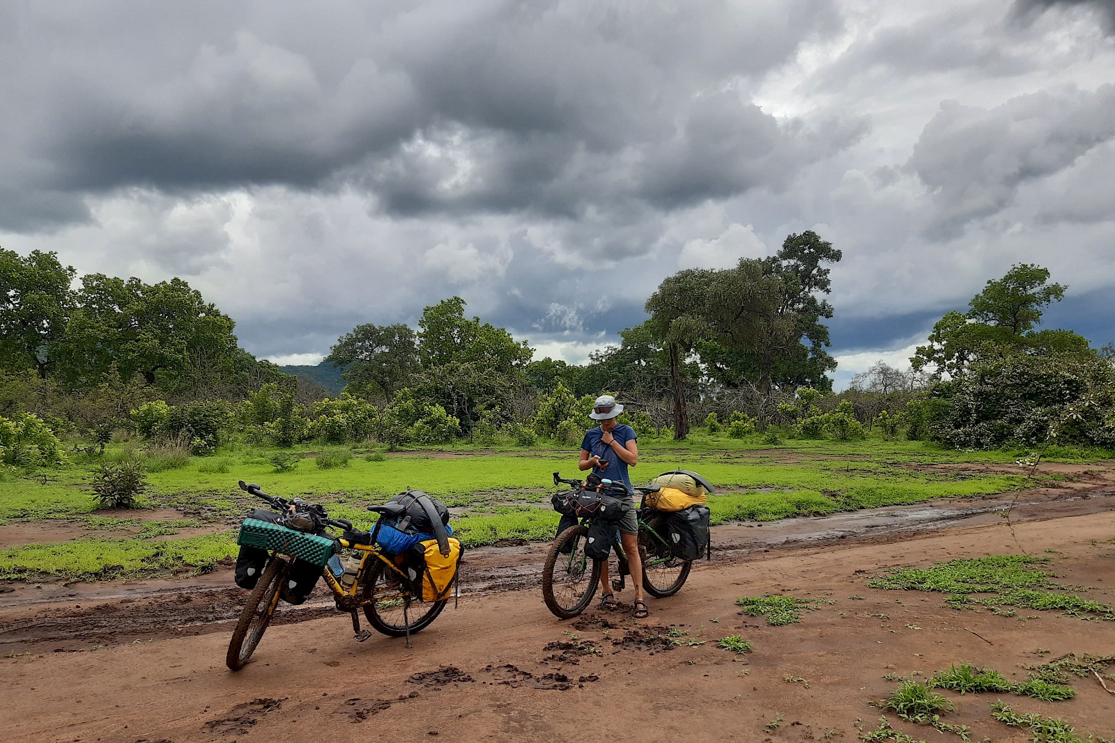 Als wir zwei Wochen später in vor Dreck starrenden Klamotten und mit zitternden Händen zum gefährlich nahen Schnauben und Grunzen der Hippos an den kleinen Befestigungsschrauben unserer Mudguards herumhantieren, um der nun ungewollten Bremswirkung des betonartig aushärtenden Schlamms entgegenzuwirken, wissen wir: Diesmal sind es nicht die Felsstufen, die uns zusetzen werden. Wir sind mitten drin in »Expedition No.2«, der »Old Petauke Road«, die bekannterweise in der Regenzeit von keinem Menschen zum Spaß befahren wird. »Klingt genau nach unserer Art von Spaß!«, dachten wir und schmissen uns zwei Tage lang hinunter in die immer nasser werdende Landschaft am Luangwa Fluss, der hier die natürliche Grenze zum South Luangwa Nationalpark bildet, um am dritten Tag mit ernstem Blick festzustellen: Alles in uns schreit zwar danach, aber Umdrehen ist jetzt keine Option mehr. Also machen wir weiter, zumal sich die Information zum Zustand der letzten 60 von insgesamt 180km mit jedem Mal Nachfragen ändert. Von »Aiaii, you will face many troubles …« über »It will be bad, but not as bad as before« bis hin zu »Oh, it’s a good road!« ist alles dabei und wir beschließen ab jetzt selektiv nur mehr zu hören, was uns Mut macht.