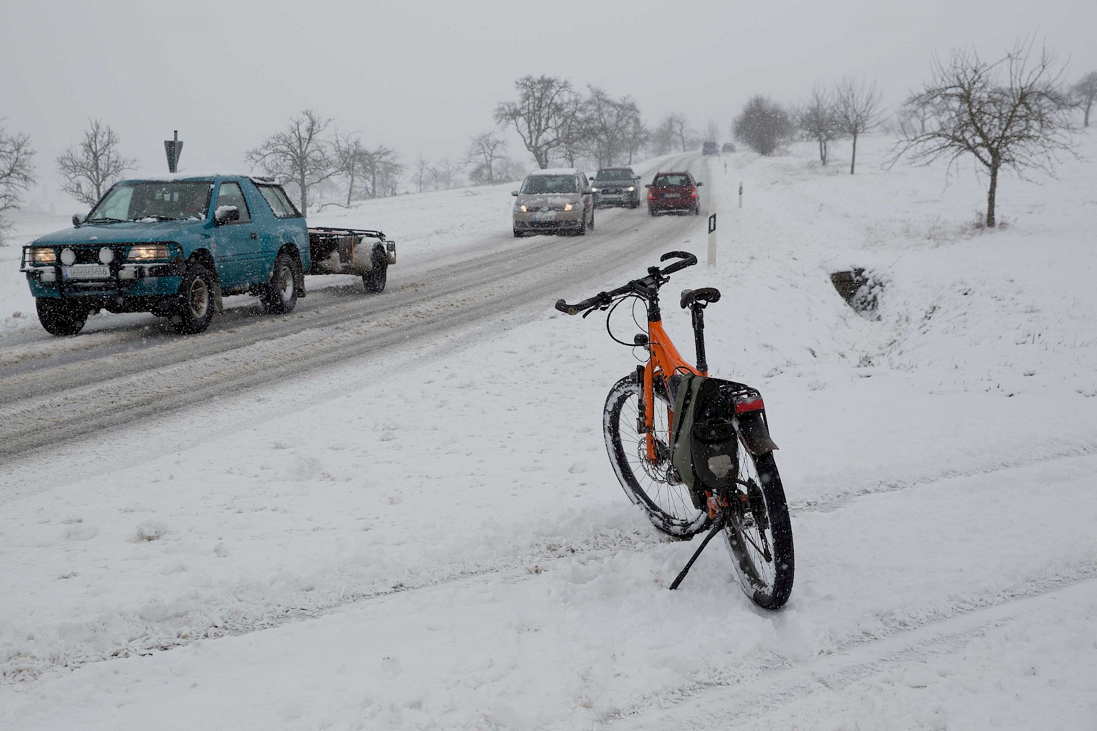 Zu Betriebsschluss schien zumindest in Weil der Stadt die Schneehöhe überschaubar und so ignorierte ich den Reifenstabel mit grobstolligen Smart-Sam-Reifen (hätte bedeutet ein völlig verdrecktes Rad umzumanteln …) genauso wie das ’rumstehende Firmenfahrzeug (mit Winterreifen) und schwang mich auf meinen E-Finder mit Super-Moto-X-Bereifung. In der Packtasche das Macbook (und der Velotraum-Datenschatz) und auf dem Rücken die Fotoausrüstung – wenn schon unvernünftig, dann richtig.