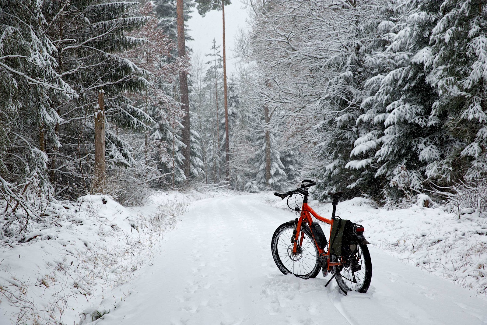 Über zwei Jahre bin ich täglich 36 km zu Arbeit gependelt. Seit dem verfüge ich über ein spezielles WINTERRAD. Als einziges meiner Räder hat es eine Shimano 7 Gangnabe mit Rücktrittbremse, die auch funktioniert, wenn die Felgenflanken vereisen. Die Nabe ist wirklich unverwüsstlich, Ersatzteile im Vergleich zur Rohloff geradezu ordinär preiswert. In der Ebene kommt man damit gut zurecht. Zusätzlich montiert ist ein chain glider als Kettenschutz. Ausserdem natürlich schwalbe spikereifen. (Nokian hatten sich augrund ihrer Pannenanfälligkeit nicht bewährt…habe noch nie in meinem Leben so gefroren!) Auf einen Gepäckträger habe ich verzichtet, weil ich finde, dass das Rad so besser ausbalanciert ist. Meine Sachen transportiere ich statt dessen in einem Ortliebrucksack, der zusätzlich den Rücken wärmt. Ich finde, dieses Rad hat sich sehr bewährt. Überfrierende Nässe, Glatteis oder eine geschlossene Schneedecke sagen wir mal bis 5 cm sind kein Problem. Der Moment der Kapitulation kommt, wenn der Schnee tiefe Fahrspuren aufweist und mehrfach überfriert.
