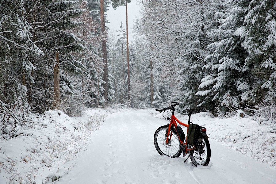 Als es kürzlich endlich einmal Neuschnee hatte, habe ich abends extra einen kleinen Umweg durch den Wald gemacht – was ist schöner als nachts durch eine verschneite Landschaft zu radeln?