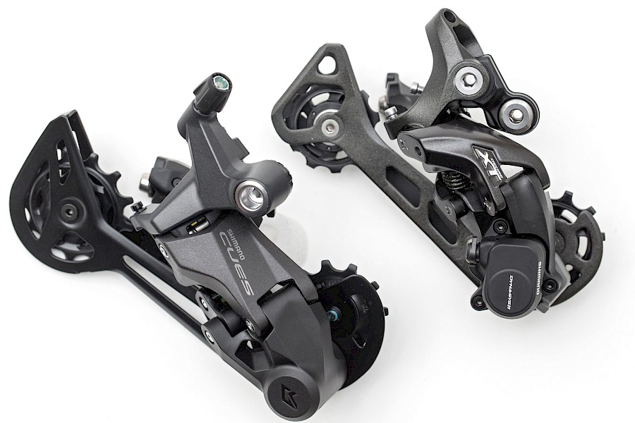 Schaltwerk – Als wir das erste Muster aus der 6000er Serie in Händen hielten, war die Ernüchterung ziemlich groß. Denn das Schaltwerk ist optisch ein ziemlicher Kaventsmann, neben dem ein ausgewachsenes XT-Schaltwerk schon fast schmächtig wirkt. Das ist unter anderem dem hohen Kunststoff-Anteil geschuldet. Also kein Ersatz für die XT, und damit wollten wir auch keine Veloträume bauen. Das 8020er Schaltwerk war dann schon deutlich ansprechender, ebenso wie die Schalthebel.