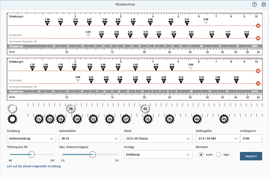Darüber hinaus kann man über verschiedene Kettenblatt- und Ritzelabstufungen auch etwas individuellen Einfluss auf die Übersetzung nehmen.