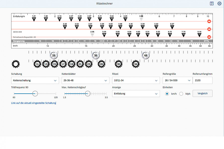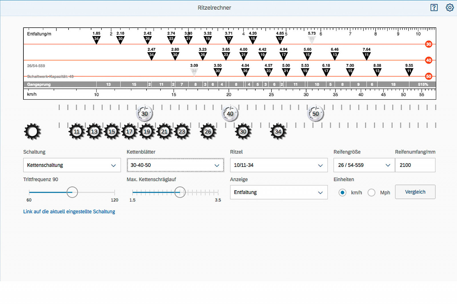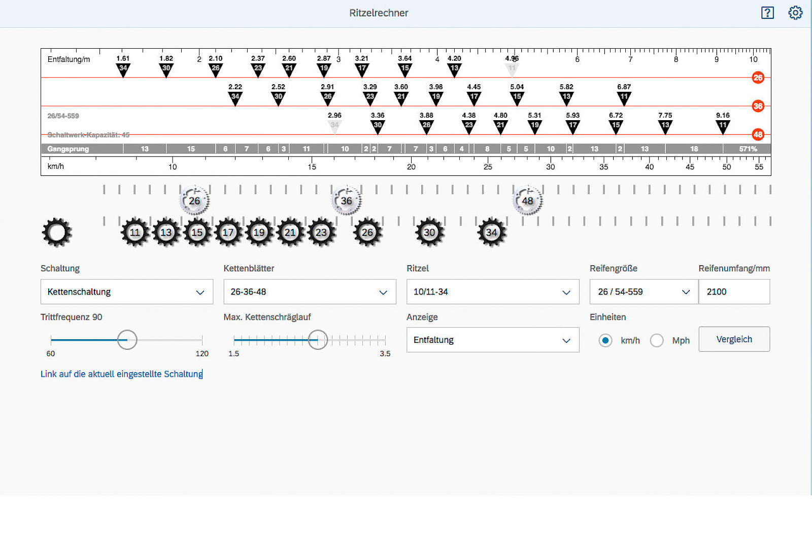 So wird es beispielsweise immer schwieriger oder sogar unmöglich, eine wirklich Gepäck- und Pässe-taugliche Entfaltung zu realisieren. Die sollte sich für einen Randonneur idealerweise zwischen 1,50 und 8,50 Meter bewegen, also um die 570 Prozent Übersetzungsbandbreite bieten. Zur Orientierung: Rohloff bietet 520 Prozent und bei der GRX mit 2×11 sind maximal 474 Prozent möglich.