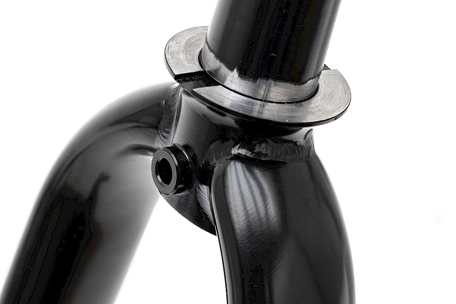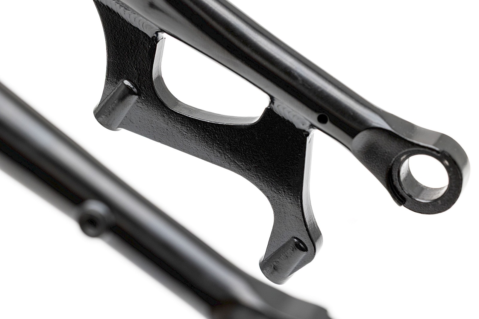 Die Stabilität der Gabel wird nicht nur durch das Material Stahl, sondern auch durch ihre elegante Form gewährleistet. Dadurch, dass sich die Gabelscheiden nach unten hin verjüngen, ist sie steif genug, um das Zuladegewicht zu erhöhen. Statt des üblichen Systemgewichts von maximal 150 kg bei unseren Alugabeln sind nun bis zu 180 kg möglich.