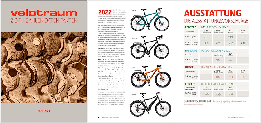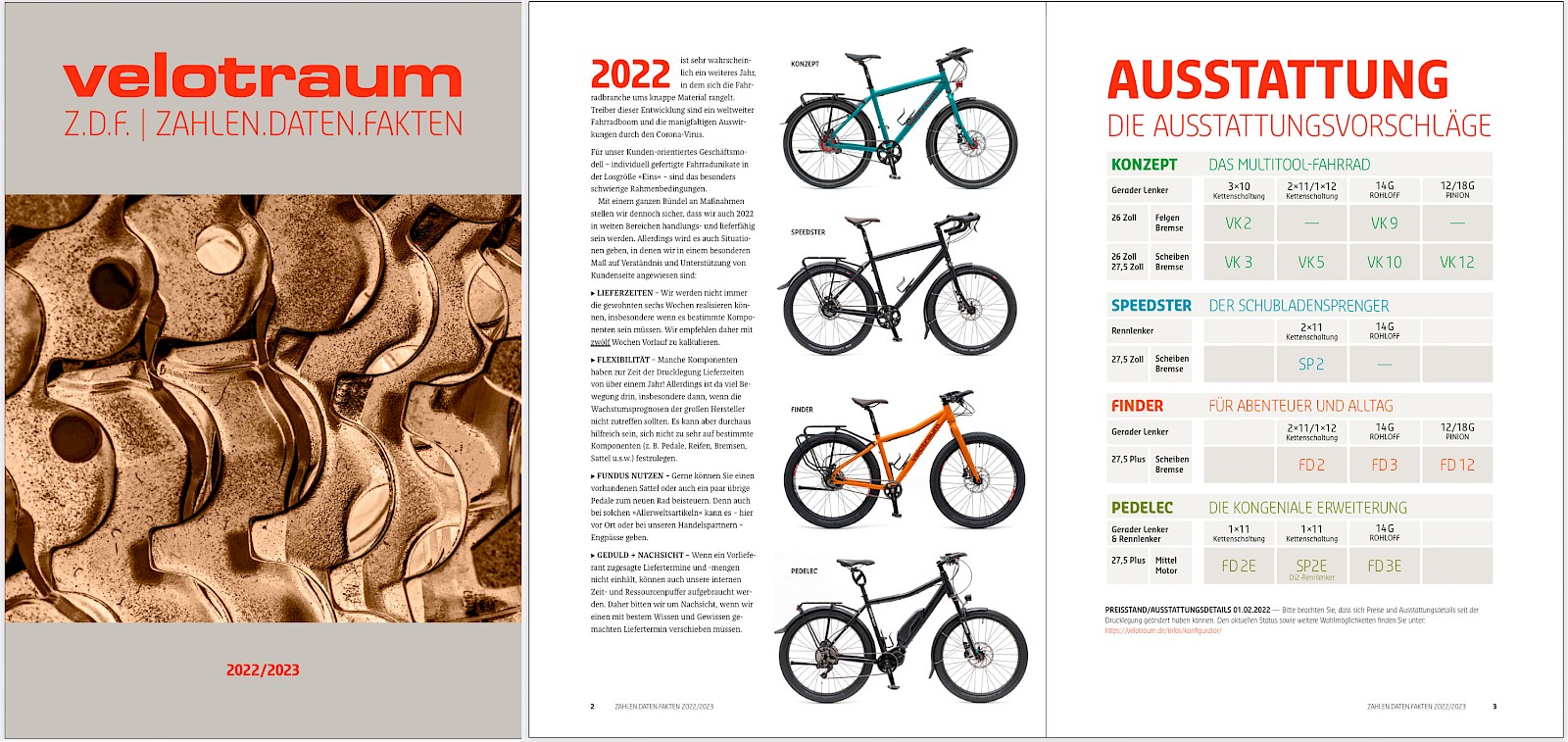 Für die Zukunft haben wir uns dazu entschieden, die ausführliche Darstellung unserer Markenphilosophie – wie tickt Velotraum – von den »Tabellenwüsten« zu trennen. Spätestens seit Corona lassen sich diese eigentlich zusammen gehörenden Inhalte nicht mehr in einem gedruckten Medium unterbringen. Während die vier Fahrradwelten und das zugrunde liegende System nicht dem saisonalen Aktionismus unterworfen sind, sind die Ausstattungsvorschläge und insbesondere die Wahlmöglichkeiten mehr denn je im Fluss.