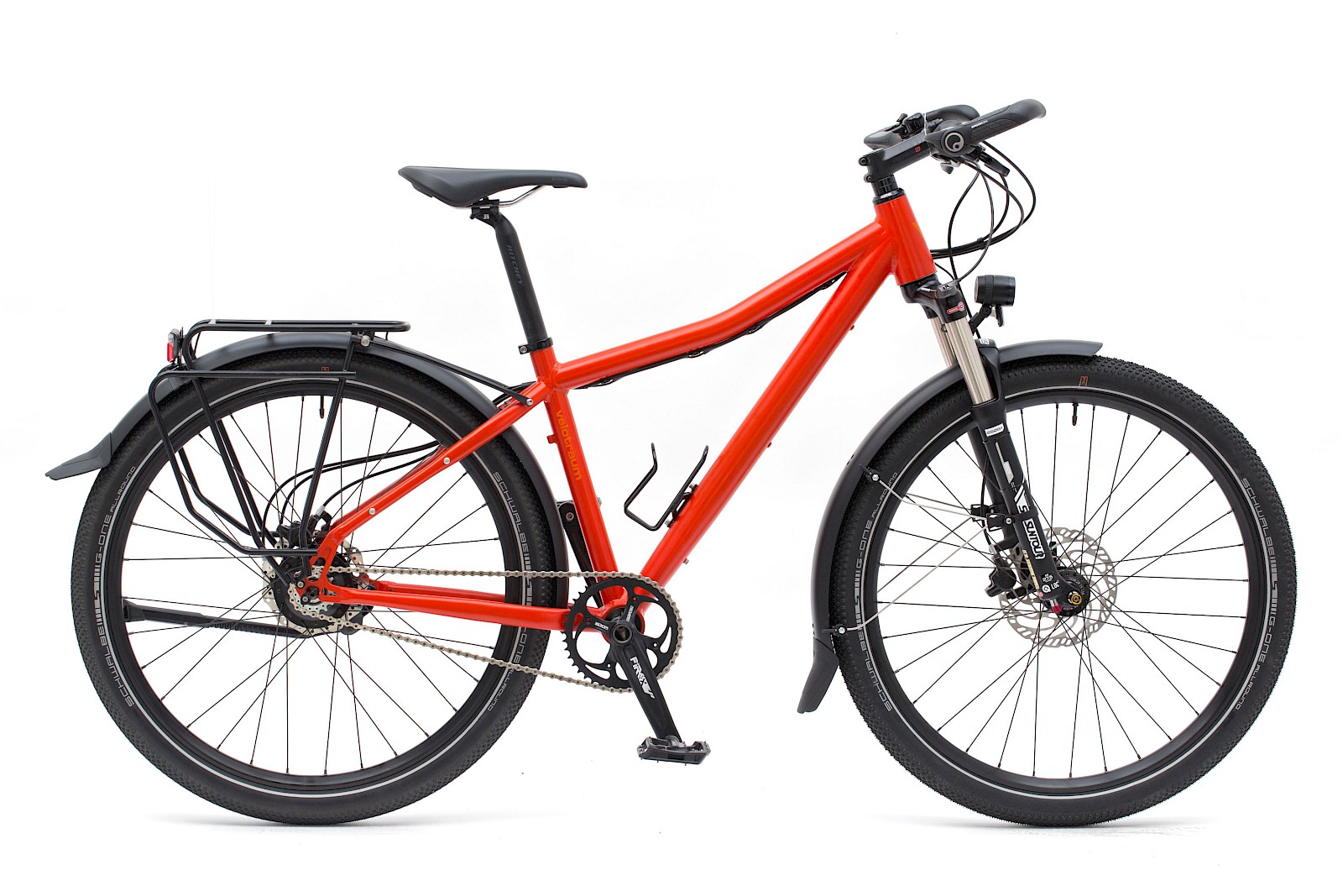 FINDER FD3 – Ein leuchtend rotes FD3 mit kompletter Alltagsausstattung für eine Kundin. Die Suntour-Federgabel erweitert nochmals den Einsatzbereich und Komfort sowie die Sicherheit. Reifenformat 57-584, Farbe RAL2002, Gewicht 16,0 kg.