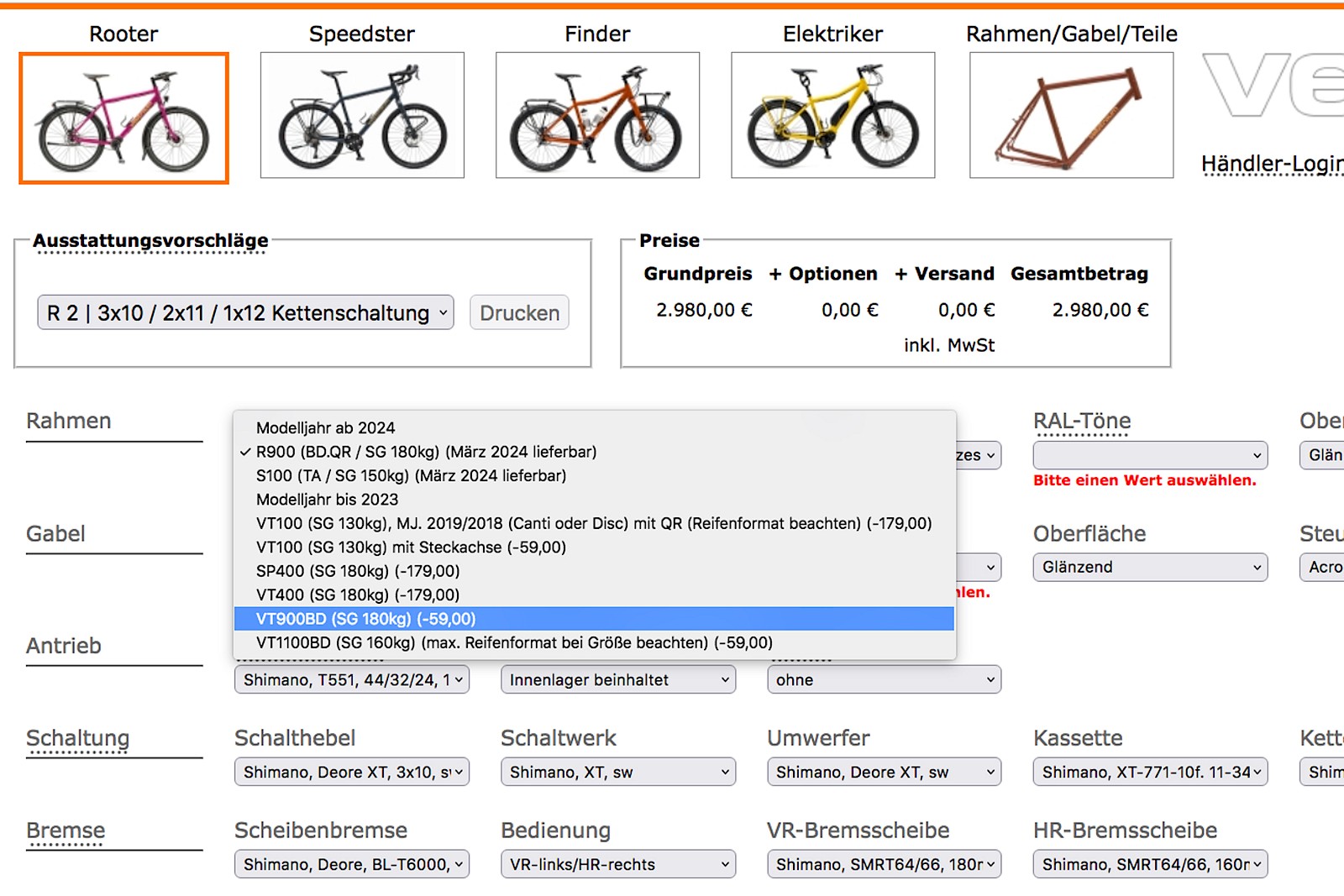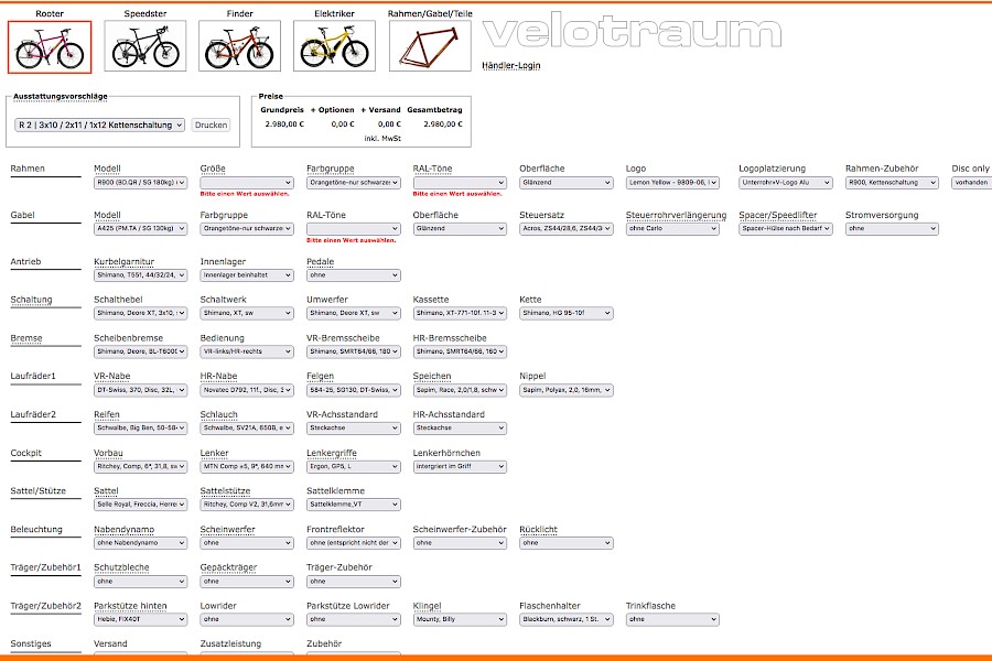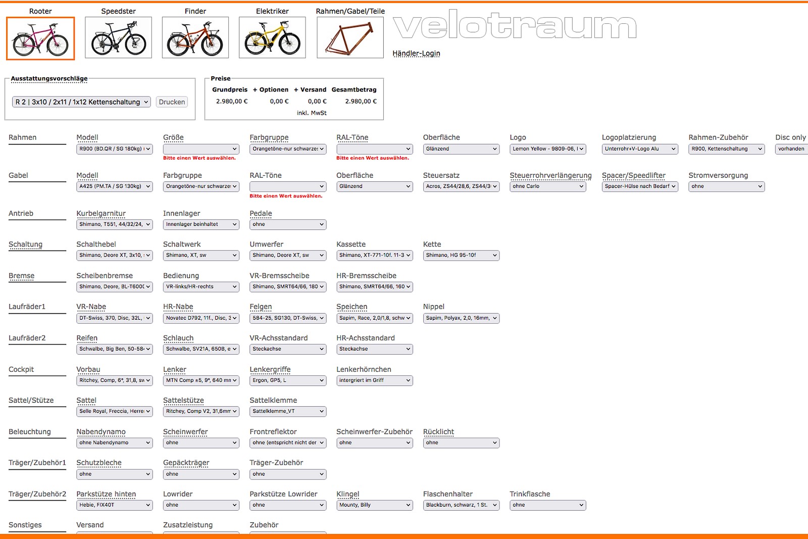 Unverändert gilt für den Velotraum-Konfigurator (noch) folgender Hinweis: »Wichtig ist es uns noch anzumerken, dass der Konfigurator in erster Linie eine Bestellplattform für unsere Händler ist. Eine sehr umfangreiche und komplexe Variantenlogik stellt dabei sicher, dass nur sinnvolle und funktionierende Kombinationen wählbar sind. Die vielfältigen Abhängigkeiten so aufzubereiten, dass auch der Laie damit zurecht kommt, ist zwar wünschenswert, aber von uns nicht zu leisten.«