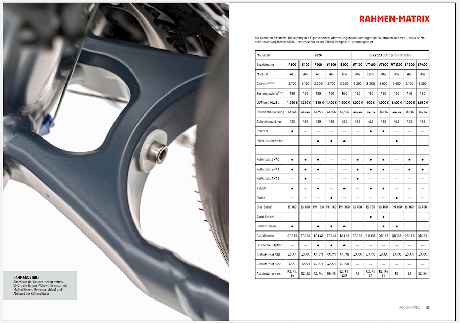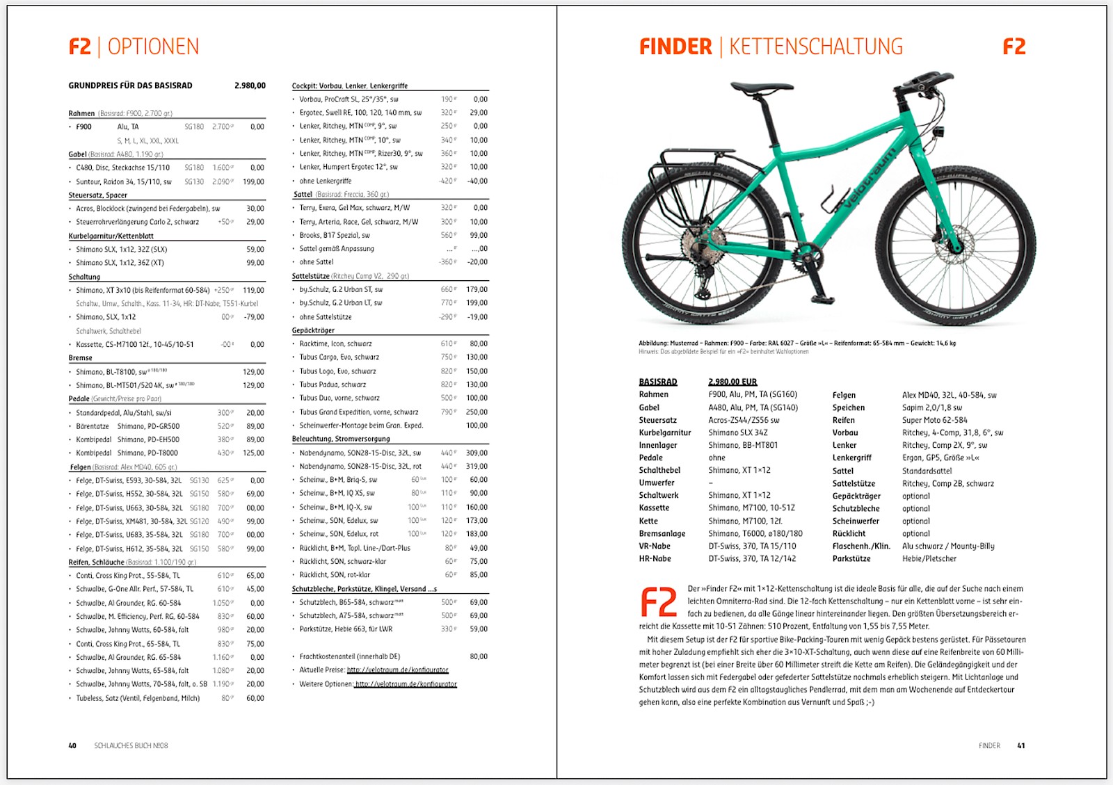 Durch die Straffung des Portfolios ließ sich dieser Wunsch nun auch ganz gut umsetzen, ohne dass der Leser seitenweise durch Tabellenwüsten blättern muss. Apropos Tabellenwüste – Die Datenblätter für die jeweiligen Basisräder haben wir gründlich überarbeitet, damit deren Spezifikation besser zu ersehen ist. Alles in allem sind 68 Seiten zusammen gekommen, auf denen wir versucht haben, die Quintessenz des Velotraum-Mikrokosmos erfahr- und nachvollziehbar zu machen.