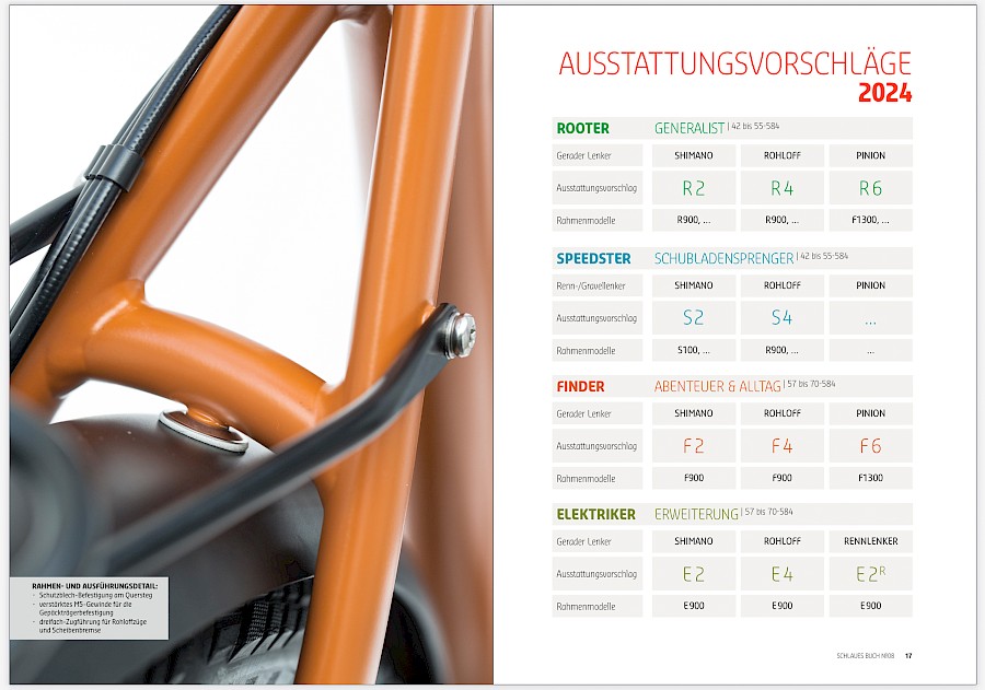 Die neuen Ausstattungsvorschläge für »Rooter«, »Speedster«, »Finder« und »Elektriker« sind online. Es war wieder mal nicht ganz einfach, die vielen Wahlmöglichkeiten und deren Ausschlüsse zu programmieren, zumal der Konfigurator nicht nur das neue und reduzierte Portfolio abbildet, sondern auch die Rahmen und Komponenten vor 2024. Diese Mischung aus alt und neu ist mitunter etwas komplex und verwirrend, bietet aber auch viele Möglichkeiten. Schließlich sind weder die »alten« Rahmen noch »alten« Komponenten altes Eisen, sondern durch die Bank bewährte Optionen, die es jetzt zum Teil mit Abpreisen gibt. Zudem wird der eine oder andere Kunde sich glücklich schätzen, noch den bisherigen Standard kaufen zu können. Denn »neu« ist ja nicht für jeden die bessere Wahl.