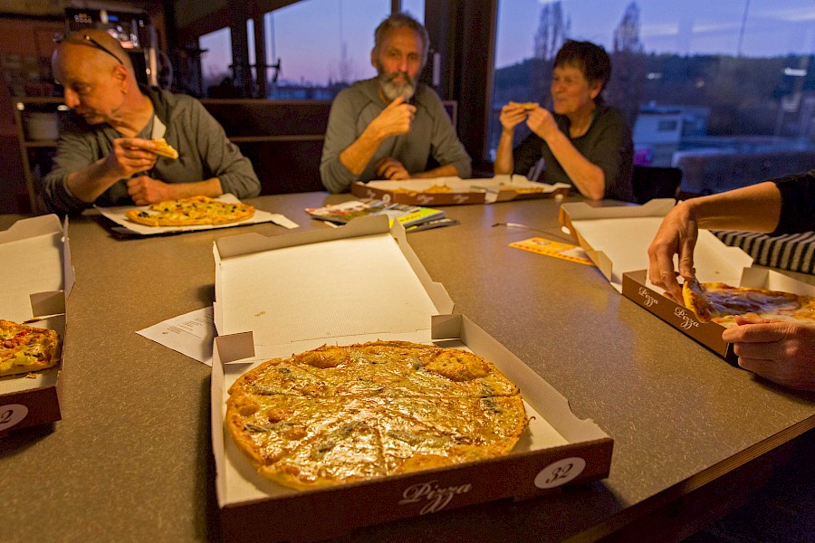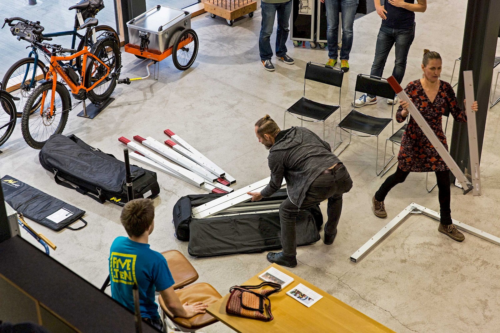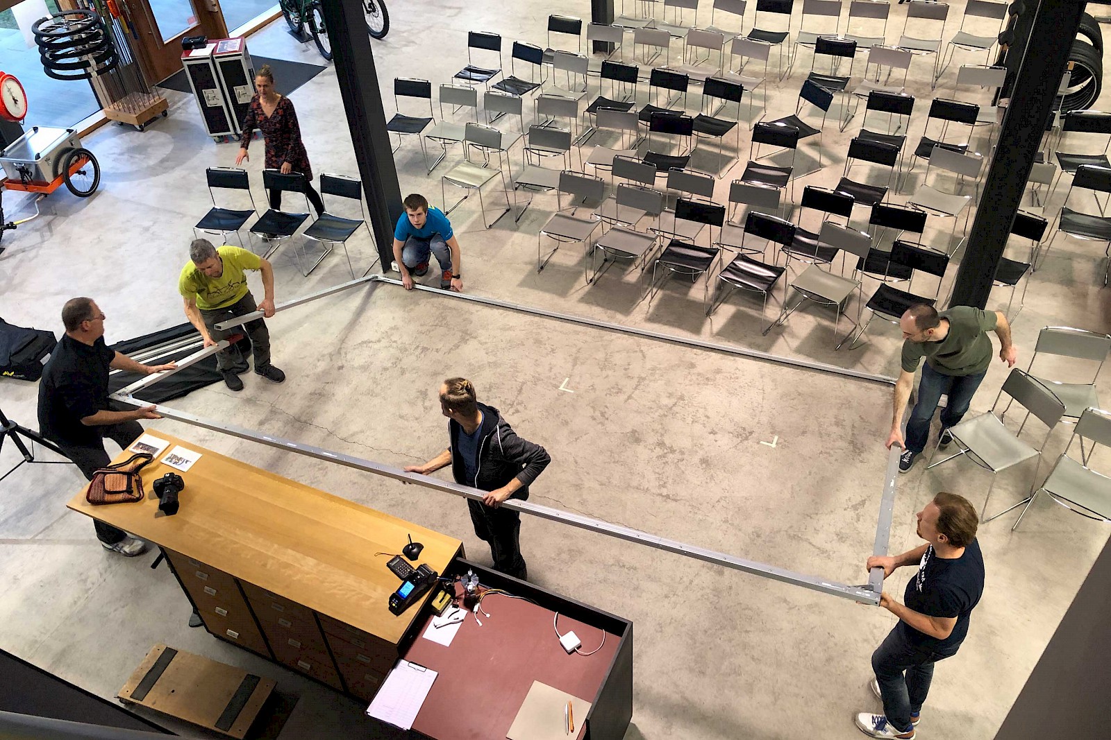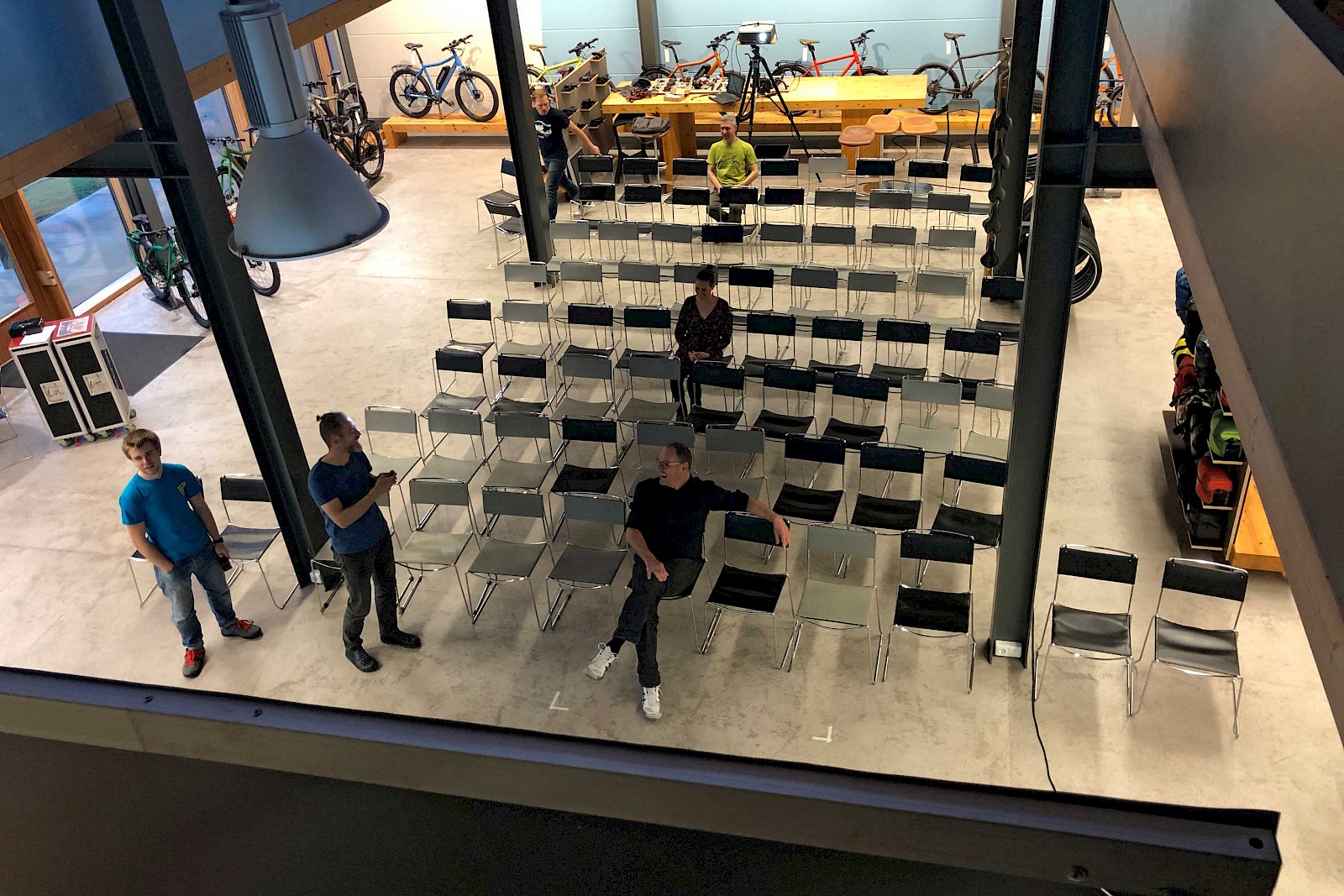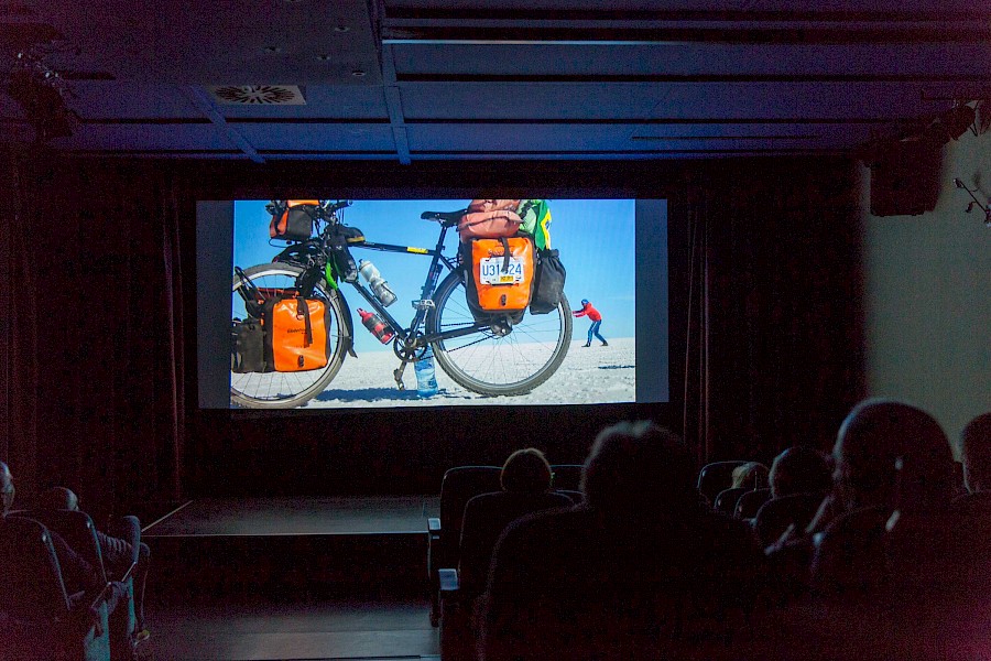 Schon der Auftakt, also der Umbau der Velotraum Ausstellung in einen Veranstaltungsraum, brachte eine »Wendung« um 180 Grad. Die 4,50 × 2,75 Meter große Leinwand wollte sich einfach nicht in das bewährte Rad-und-Reise-Setup einfügen. Von Andi kam daher der Vorschlag, einfach in die andere Richtung zu projizieren … Gesagt, getan – Kurzentschlossen drehten wir das Ganze um 180 Grad und die Live-Reportage konnte ihre ganze visuelle Pracht entfalten.
