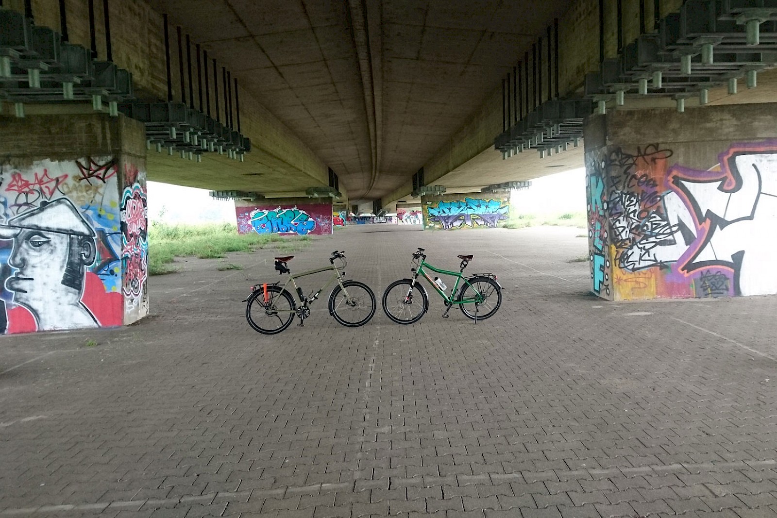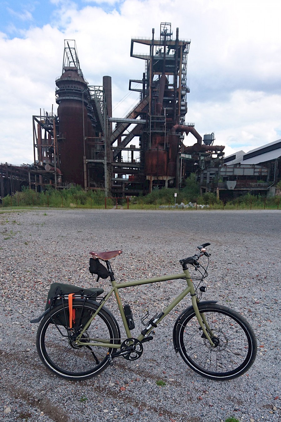 Hier nun ein kleines Kontrastprogramm. – Das Stahlross vor dem Stahlkoloss auf dem tägliche Weg zur Arbeit.Bis 2000 wurde hier in Dortmund Hörde noch Stahl produziert, nun ist es ein Industriedenkmal. Inzwischen gibt es viele Radtouren durch das Ruhrgebiet vorbei an Industriedenkmalen und Halden. Unsere beiden Räder auf der ersten Ausfahrt: Nebenstrecke des Ruhrtalradweges unterhalb der A45 mit monumentaler Autoarchitektur und Graffiti des Jugendprojektes Faktor Ruhr.