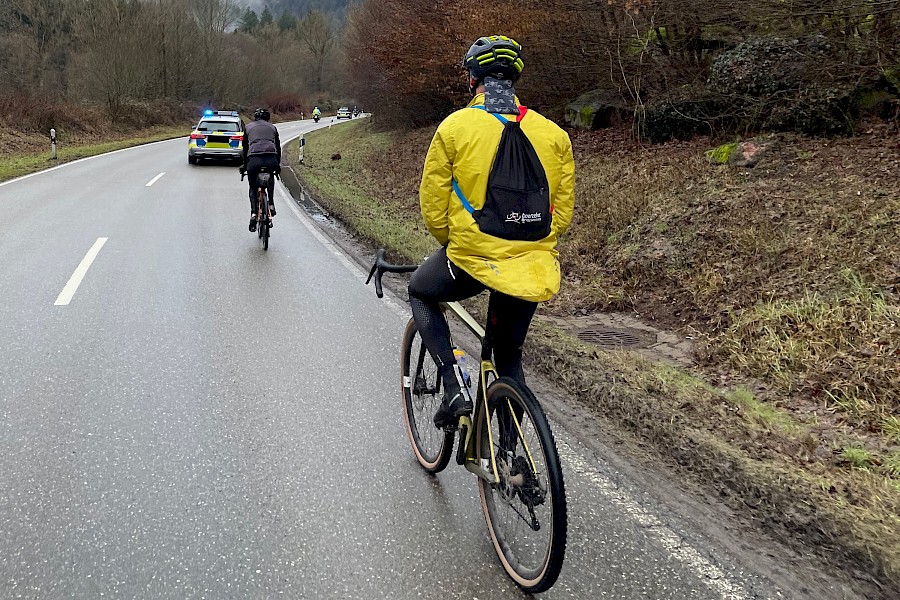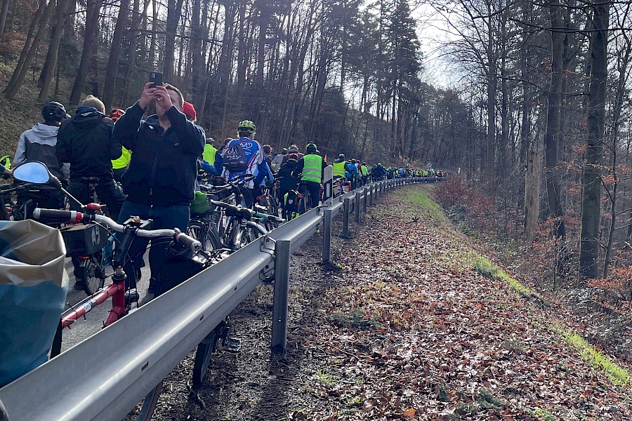 Beginnend in Stuttgart-Vaihingen gab es bereits eine „Zubringer-Demo“ nach Pforzheim. Dieser schloss ich mich gegen 8:10 Uhr in Renningen an. Nach einer Pause in Weil der Stadt und weiteren Personen, die sich dort – hauptsächlich – von der S-Bahn kommend der Demonstration anschlossen, waren wir bereits 90 Personen. Von der Polizei begleitet ging die Fahrt durch das Würmtal nach Pforzheim. Der Fahrer des Polizei-Motorrads lies sich beim sperren von Zufahrten gern von Teilnehmenden der Demo ablösen / unterstützen.