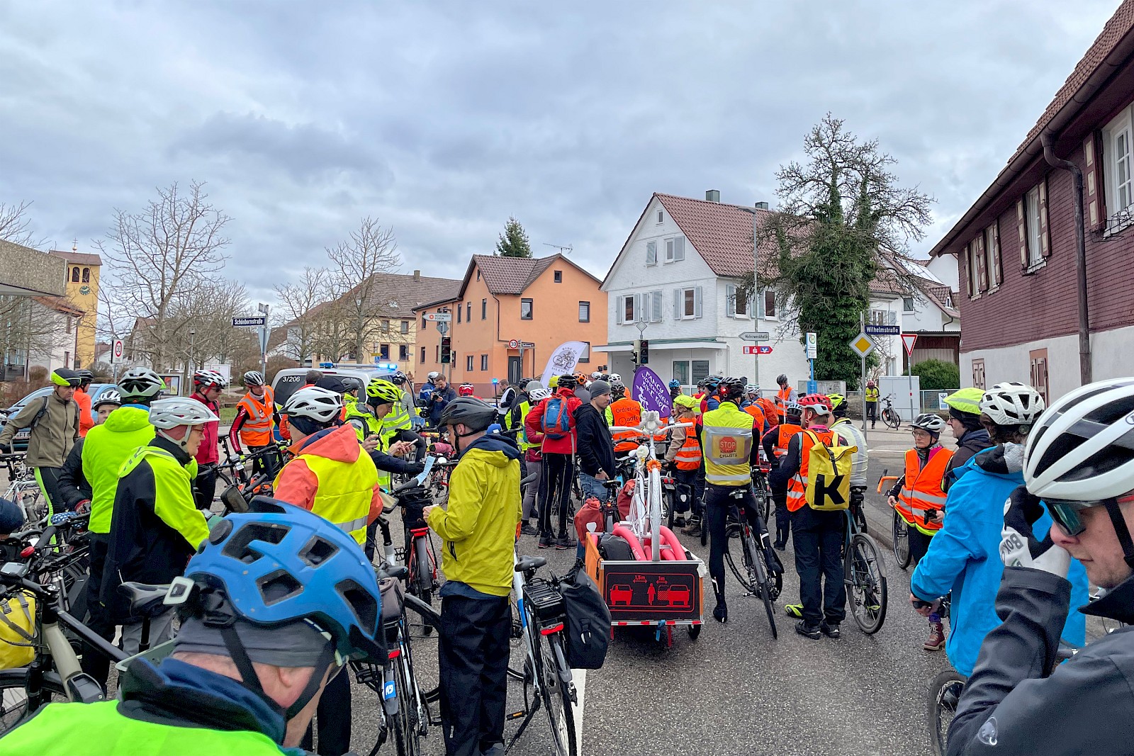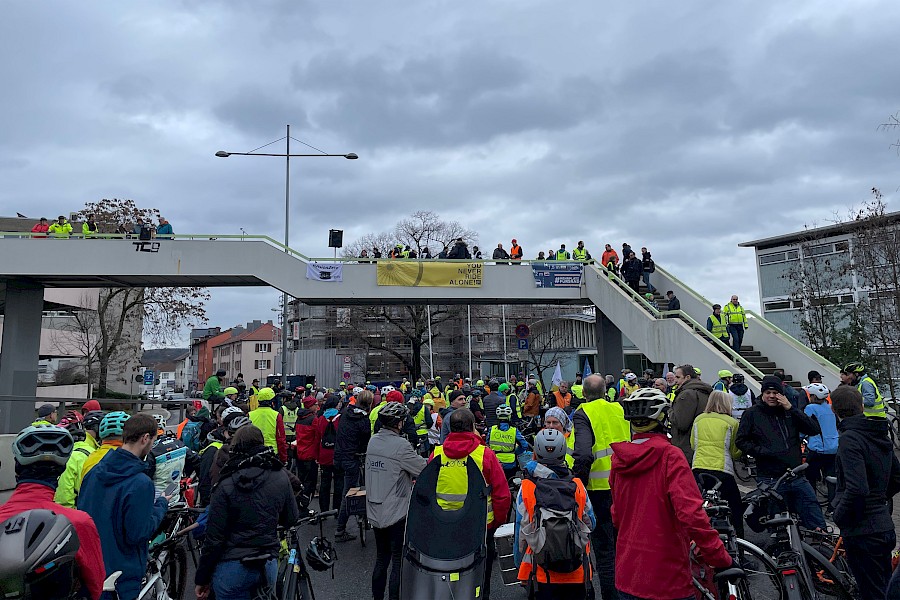 In Pforzheim angekommen gab es vor der dortigen Staatsanwaltschaft zunächst eine ausführliche Kundgebung mit Rednern wie Martin Mäschke vom ADFC Pforzheim, Christoph Schmidt als Mitglied des ADFC Bundesvorstands, Hermino Katzenstein als Abgeordneten im Landtag Baden-Württemberg, Jochen Eckart als Professor von der Hochschule Karlsruhe, Mitglieder des Open Bike Sensor-Vereins und weitere.