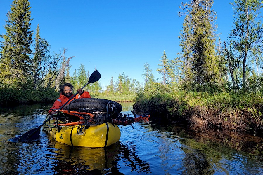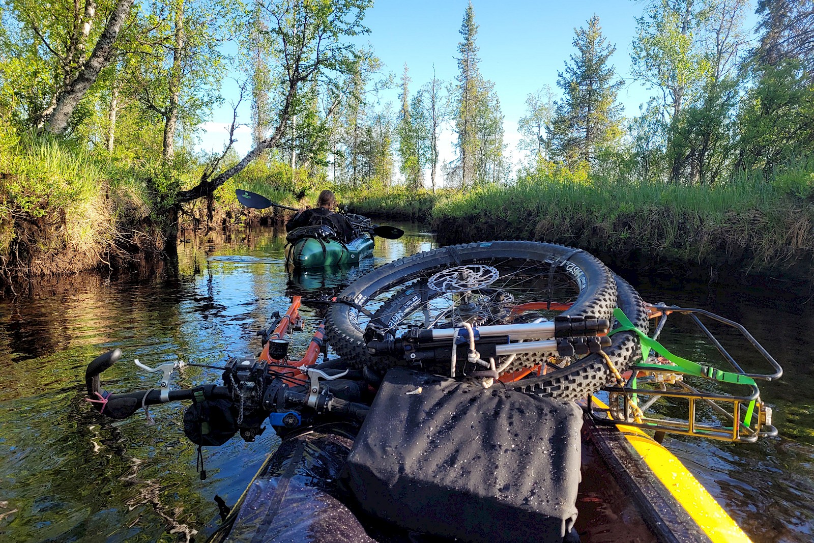 Wir packten unsere »Packrafts« (aufblasbare Leichtboote, Gewichte um die 4,5kg) auf unsere Fahrräder, um dann einige schöne Trails entlang des Flusses hinauf zu radeln, um dann die Fahrräder auf das Packraft zu packen und den Fluss hinunter zu paddeln.