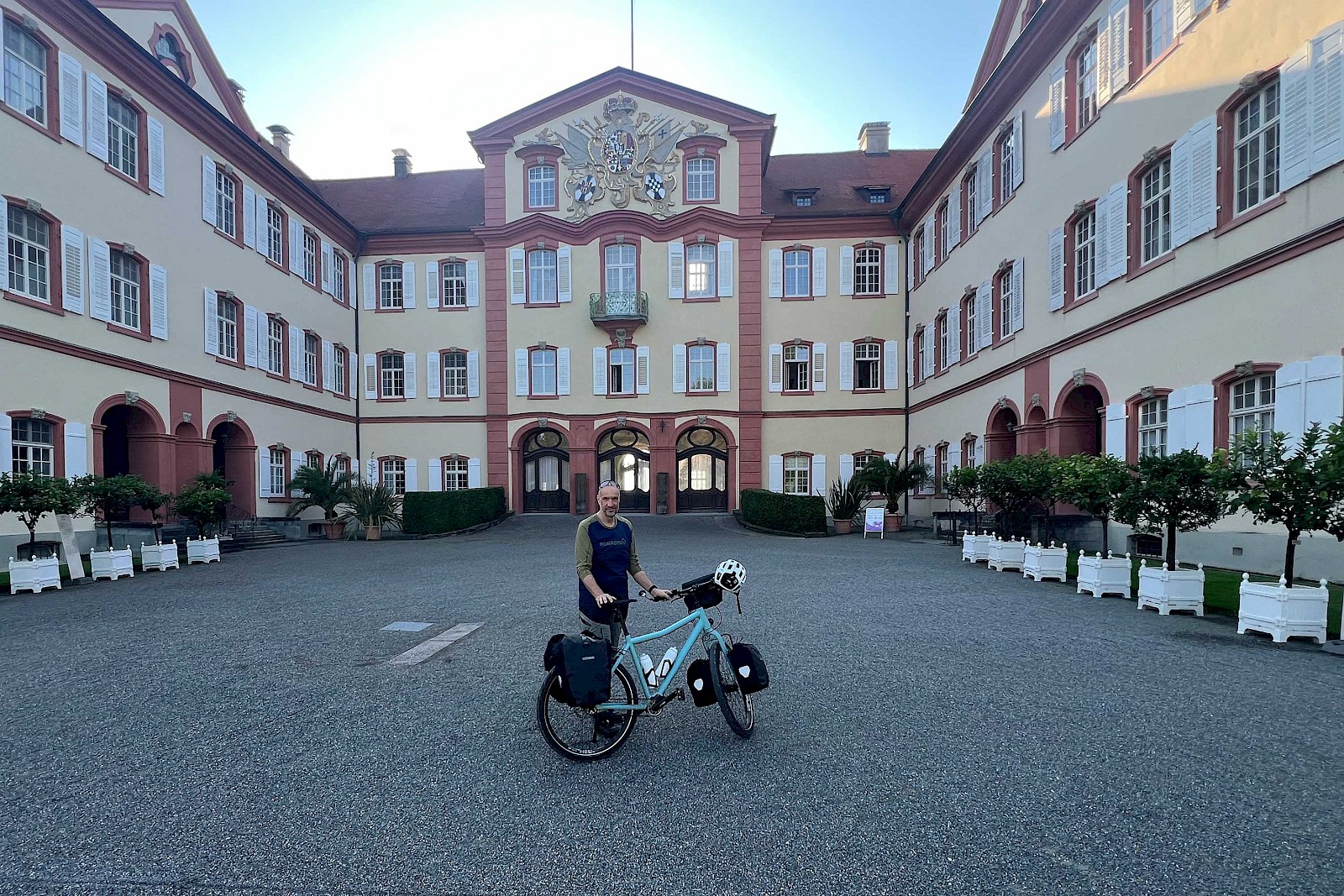 Gestartet bin ich bei uns im schönen Spessart und über Weil der Stadt (Danke für den tollen und unkomplizierten Support) an den Bodensee, genauer zur Insel Mainau, gefahren. Da ich durch meine berufliche Tätigkeit Kontakte zur Insel Mainau habe, hatte ich die Möglichkeit ein Foto mit dem Rad direkt vor dem Schloss zu machen, auch wenn es eigentlich nicht gestattet ist, mit dem Rad auf die Insel zu fahren.
