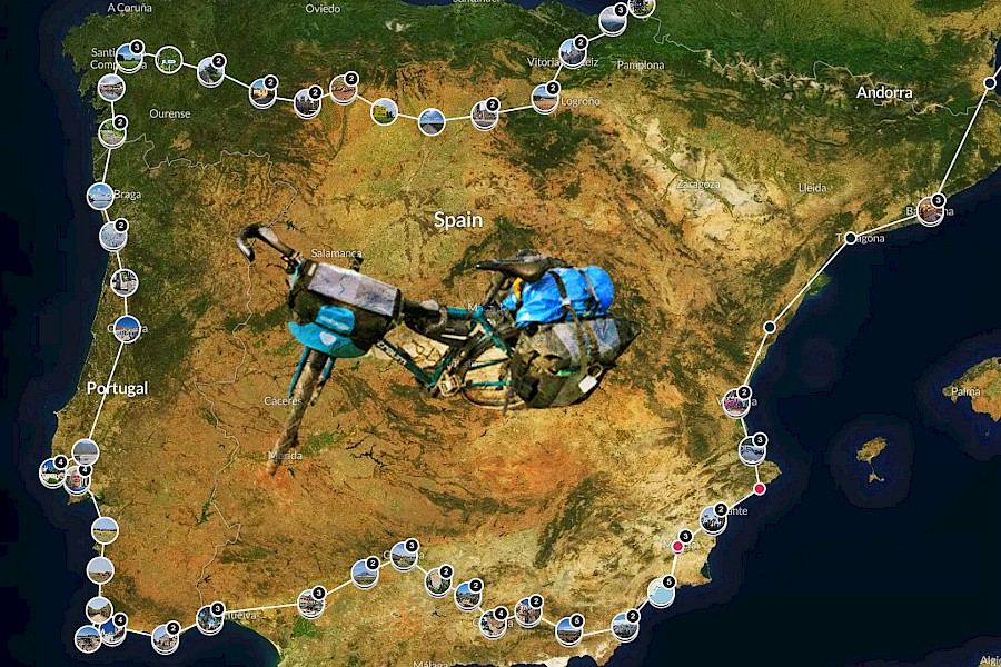 Natürlich ging es nicht zuhause los, sondern (nach Transfer mit Flixbus und Zug) in Valencia. Es ging zunächst die Mittelmeerküste entlang, um dann über die Sierra Nevada zu den Highlights Andalusiens abzubiegen. Zurück am Mittelmeer ging es die Algarveküste bis an die westliche Spitze Portugals. Über Lissabon, Sintra, Coimbra und Porto erreichte ich Santiago de Compostella weitgehend auf dem »camino portugues«, einem der vielen Jakobswege. Den bekannteren »camino frances« fuhr ich entgegen der Pilgerströme über Leon und Burgos nach San Sebastian und über die französische Grenze. Dort wurde ich dann abgeholt.
