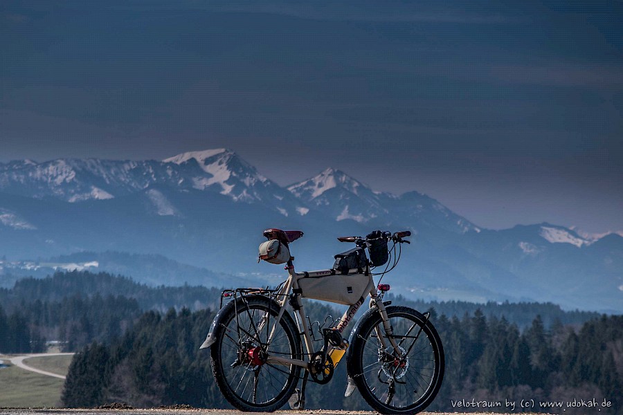 Hier vor der prächtigen Kulisse der Chiemgauer Alpen (Hochfelln 1674m und dahinter Hochgern 1748m). Love to ride my Velotraum.